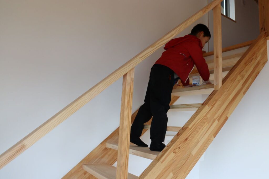 さらに、床や階段のオイル仕上げも、お子さんと一緒に楽しんでいました。